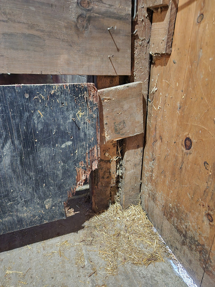 Photo – Dommages à l’enclos du bétail par où les chiens seraient entrés. (Lise Soucie)