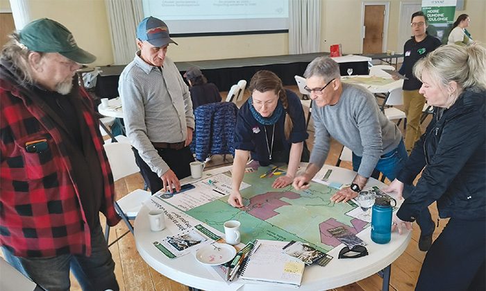 Cette initiative fait partie de quatre sites choisis par le ministère du Tourisme du Québec et le ministère de l’Environnement, de la Lutte contre les changements climatiques, de la Faune et des Parcs dans le cadre d’un « projet pilote pour le développement de reserves de biodiversité visant à promouvoir un tourisme responsable et durable », nancé par le Plan d’action 2020-2025 pour un tourisme responsable et durable. Des participants marquent des zones d’intérêt sur des cartes lors d’une consultation tenue le 4 février à Fort-Coulonge concernant la réserve de biodiversité proposée du basin versant des rivières Noire et Coulonge. (CF)