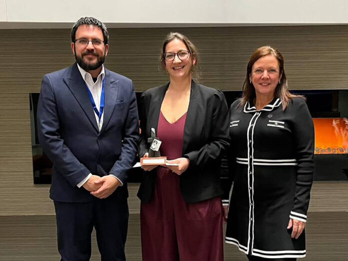 Photo : Stéphanie Hébert Potter (au centre) accepte le prix Azimut Argent pour la Route 148 au nom de la MRC Pontiac, accompagnée du sous-ministre Jessy Baron (à gauche) et de la ministre du Tourisme, Amélie Dionne (à droite). (Photo: Soumise)