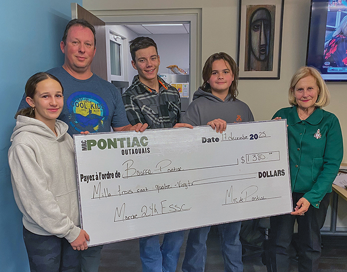 Photo : La préfète Jane Toller remet un chèque de 1 380 $ à des élèves de l’École secondaire Sieur-de-Coulonge et à l’enseignant Martin Bertrand, en appui à leur marche de 24 heures visant à amasser des fonds pour Bouffe Pontiac.