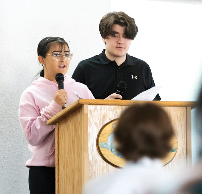 Photo – Les élèves Ève Labonté et Xavier Lagarde prononcent les mots d’ouverture lors du forum jeunesse à Campbell’s Bay le 27 mars. (WD)