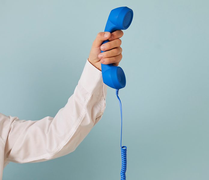 Human hand holding retro phone receiver against copy space background. Cropped shot of young man holding blue landline telephone receiver on light blue copyspace background. Customer support concept